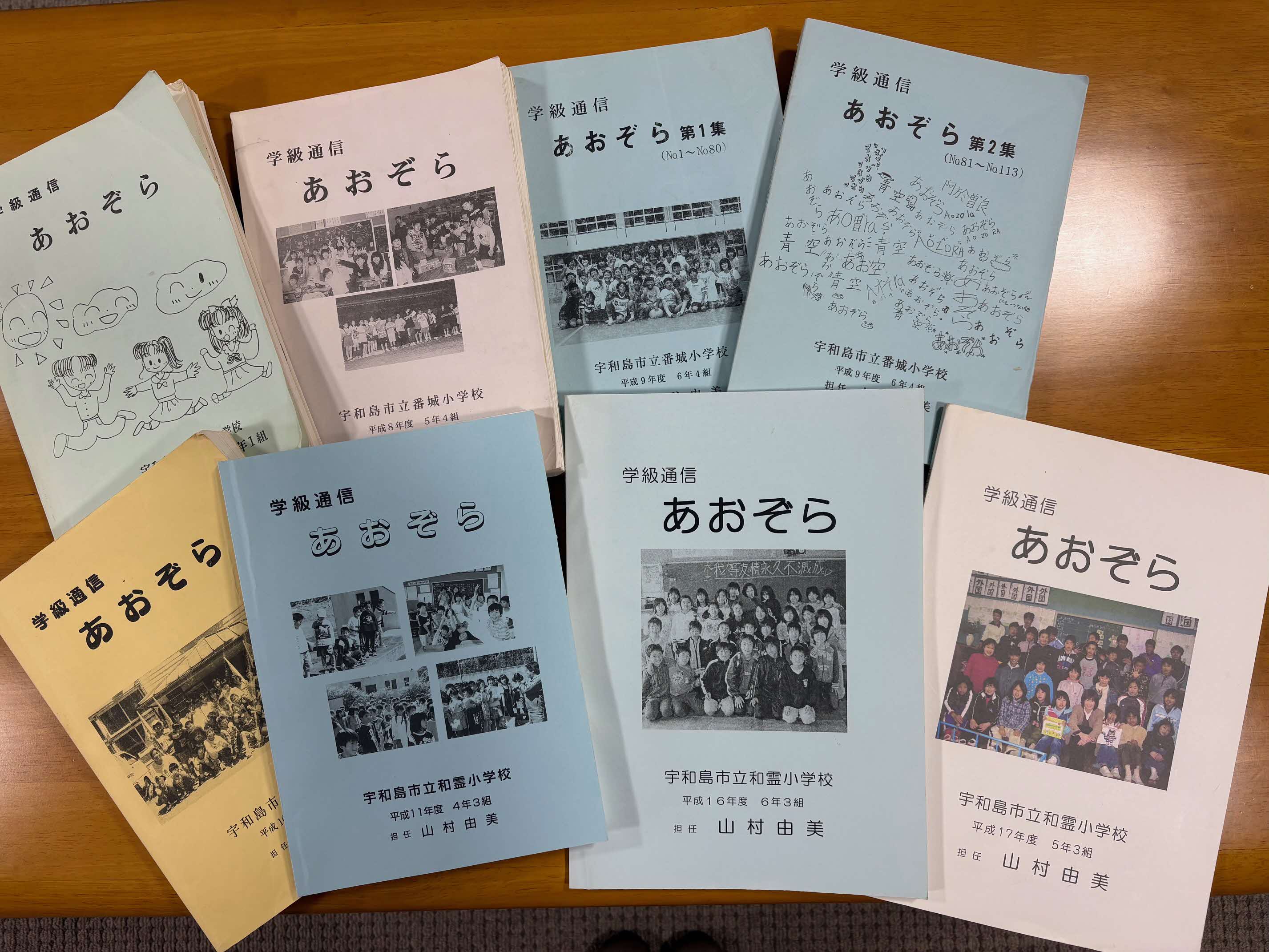 私が定年退職を迎えた際、教え子たちが祝いの会を開いてくれました。そのとき、この「あおぞら」を持って来ている教え子がいました。胸がいっぱいになりました。現在教員となっている教え子は、「時々『あおぞら』を読んで参考にしています。」とも話してくれました。また、当時の保護者に久しぶりに会うと、「今も大切に保管しています。」という言葉をいただくこともありました。何気ない毎日の通信が、誰かの心の中で生き続けていることに深い喜びと感謝を感じました。